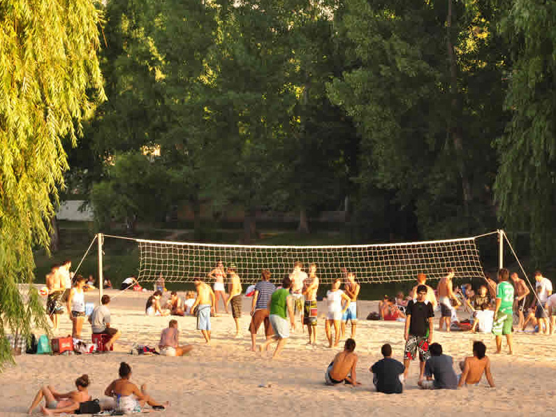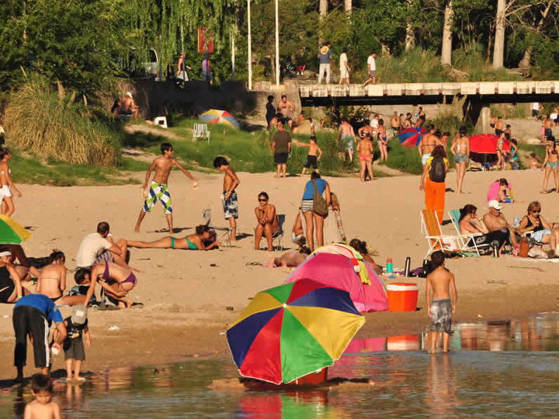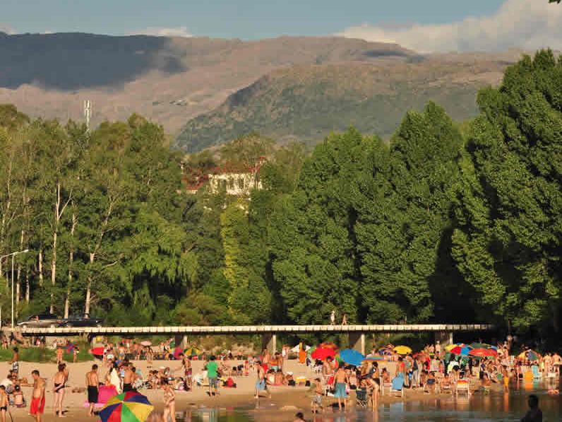La playa central de Mina Clavero se encuentra ubicada entre la avenida San Martín y calle Olmos. En esta playa, punto de encuentro durante el día, se realizan competencias deportivas y recreación para todas las edades.